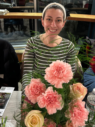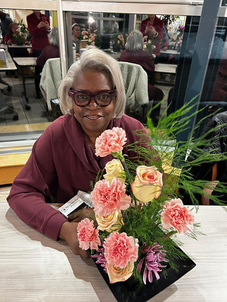 On Feb. 11, under the aegis of the Adult School in a sold-out class, our president and noted designer Fran Ackerly, assisted by photographer (and noted designer) Barbara Baletti, demonstrated the step-by-step procedure to create a lovely American Traditional Galentine’s Day design with carnations, mums, veronica and ferns. The class carefully followed Fran's expert instructions and enjoyed every moment ― as was evident as they proudly and carefully carried their creations out of the Library doors.